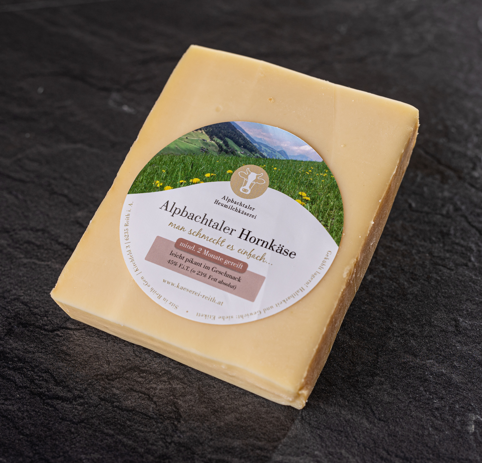Alpbachtaler Hornkäse to ser, który doskonale łączy tradycję alpejskiej produkcji z wyrazistym, naturalnym charakterem dojrzewania w piwnicy. Wytwarzany z wysokiej jakości Heumilch (mleka siennego) od krów wypasanych na bujnych pastwiskach regionu Alpbachtal, wyróżnia się piękną, czerwonawą, maślaną powierzchnią oraz półtwardą, jędrną strukturą. Jego smak jest harmonijny i bogaty: od delikatnie łagodnego, poprzez lekko kwaskowaty, aż po subtelnie pikantny i cierpki, z charakterystycznym ziołowo-ziemistym akcentem nadającym mu wyjątkową głębię. To ser stworzony z pasją, przywiązaniem do jakości i szacunkiem dla natury — prawdziwa specjalność regionu, idealna dla miłośników autentycznych alpejskich smaków i rzemieślniczych produktów.